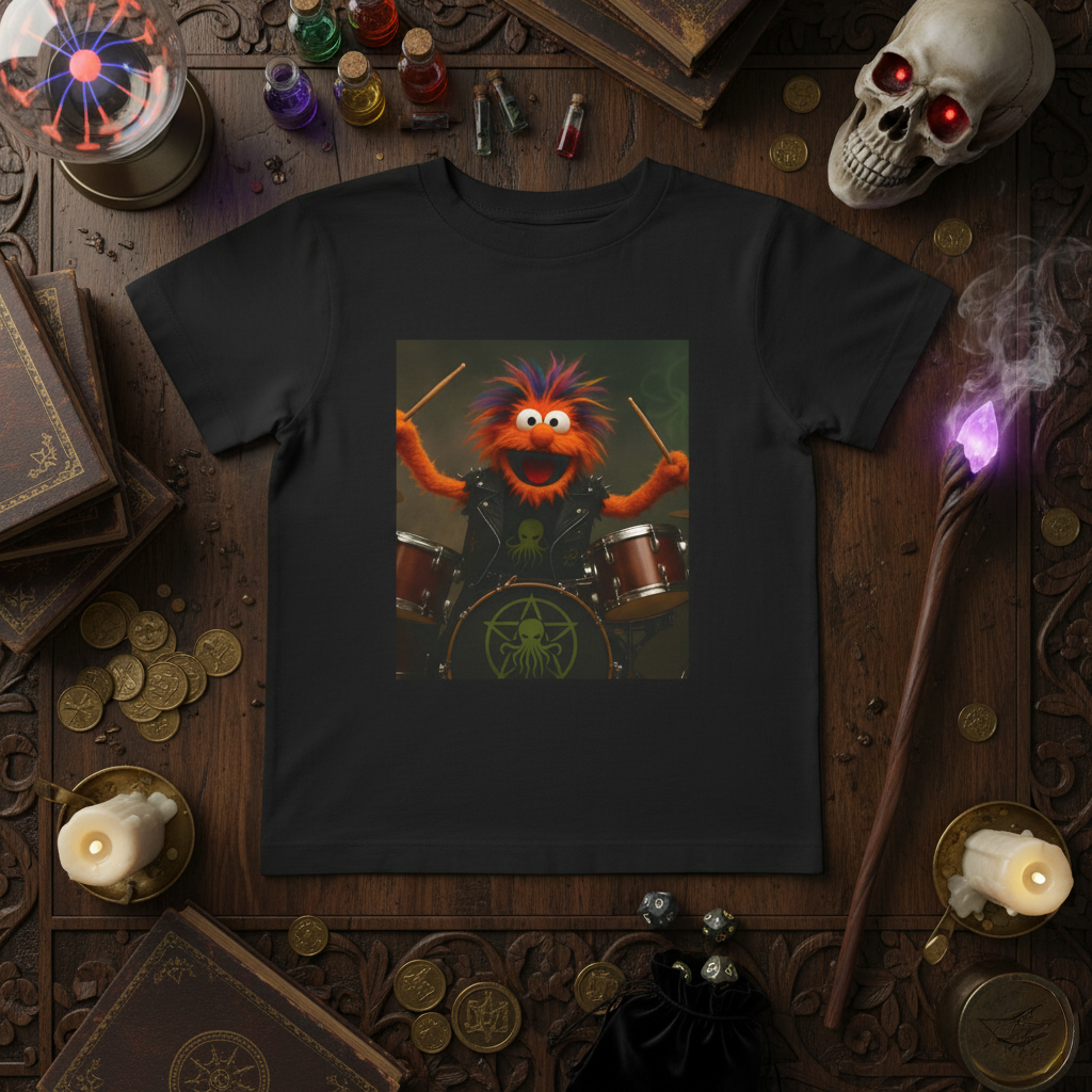 Whether they’re pounding on pots or summoning forbidden grooves, this shirt brings a pulse of fun (and just a hint of eldritch energy) to any toddler’s outfit.