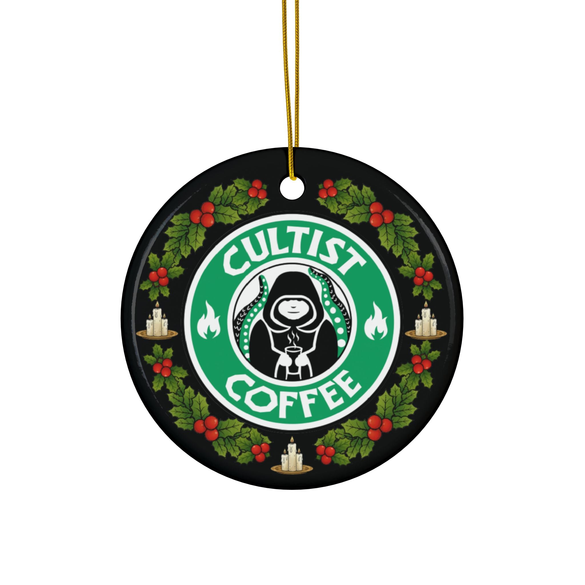 Fuel your holidays with madness and caffeine. The Cultist Coffee Ceramic Ornament features the iconic tentacled cup sigil printed in vivid detail on both sides, ready to hang on your tree, altar, or break room summoning circle. Made from glossy ceramic, it reflects festive lights—or eldritch fire—with perfect clarity.